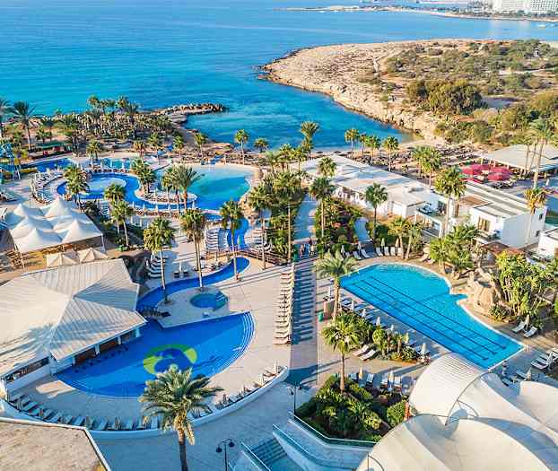 Adams Beach Hotel har ett härligt läge direkt vid stranden och på hotellet finns ett brett utbud av faciliteter som passar hela familjen. Hotellet ligger i i utkanten av Ayia Napa och här finns tre fina poolområden omgivet av palmer och med havet som närmaste granne. Här kan du njuta av sköna bad, roliga åk i vattenrutschbanorna och läskande drycker i poolbaren. Vill du kombinera sköna semesterdagar runt hotellets trevliga poolområde med salta havsbad är Adams Beach Hotel perfekt för dig då du enkelt kan ta dig från poolområdet till stranden.