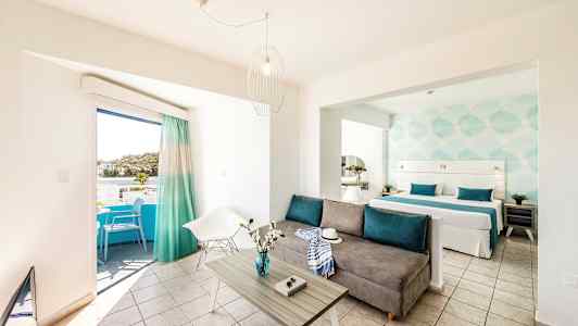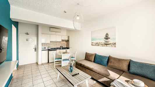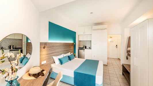 Lantiana Garden erbjuder ljusa och fina lägenheter med trevliga inredningsdetaljer i turkos.