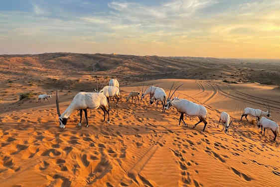 Ras Al Khaimah bjuder på några av de vackraste solnedgångarna jag någonsin har sett. Och att åka på jeepsafari i Al Wadi-öknen är både fridfullt och helt magiskt. Vår tur började i Nature Reserve, som är en del av det imponerande Ritz Carlton Resort. Tiden stod stilla, och planen var egentligen att vi bara skulle vara ute i 35 minuter. Men den planen gick i stöpet då de vackra nationaldjuren, oryxantiloperna, fortsatte att visa oss vägen till nya vackra utsiktsplatser, samtidigt som falkarna flög över oss. Plötsligt var det mörkt.