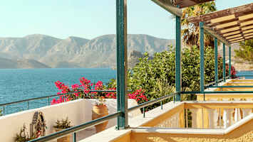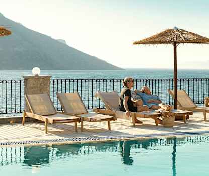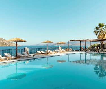 Hotellet har ett fint poolområde med utsikt över havet och grannön Telendos.