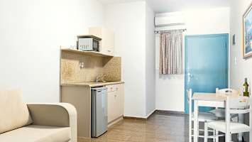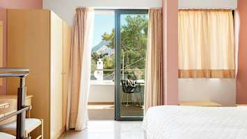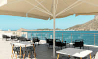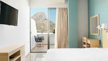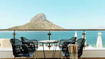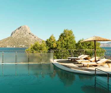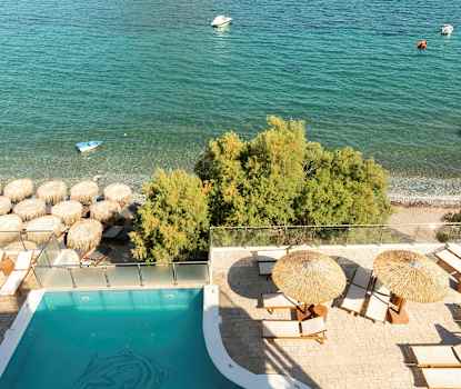 Hotellet har ett fint litet poolområde med utsikt över havet och grannön Telendos.