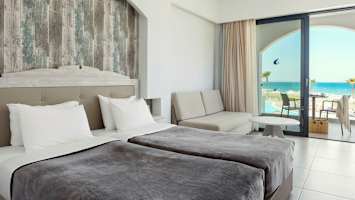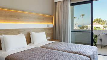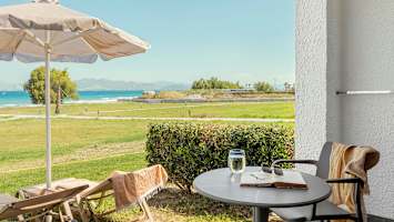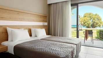 Aeolos Beach erbjuder dubbelrum i huvudbyggnaden samt dubbelrum och juniorsviter i olika typer av bungalower som ligger utspridda i hotellets stora trädgård. Från flera rum har du en härlig havsutsikt.