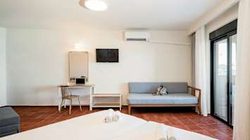 ligger flera trevåningsbyggnader utspridda, med ljusa rum för upp till sju personer. Rummen har balkong eller terrass och du väljer själv om du vill ha utsikt mot omgivningarna, poolområdet eller havet när du bokar.