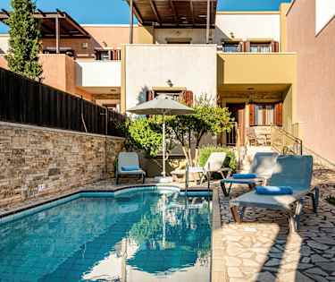 som fyra sovrum, tre badrum och ett stort vardagsrum och kök i öppen planlösning. I den stenbelagda privata trädgården finner du en grillhörna med utemöbler samt en pool. Här kan du njuta av den grekiska solen i en solstol och ta svalkande dopp, och skulle du vilja bada i havet ligger stranden nära.