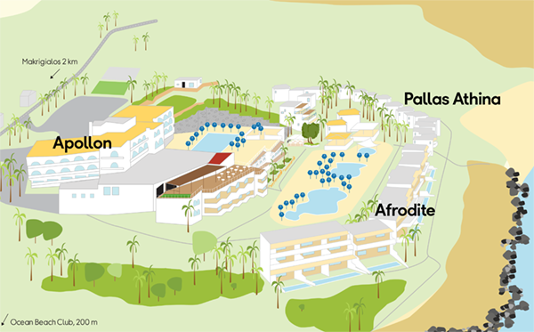 Sunwing Makrigialos Beach består av fyra byggnader. Apollon är hjärtat på resorten. Hera hittar du snett nedanför, Afrodite och Pallas Athina ligger nära havet.