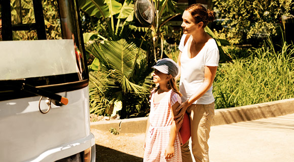 Busstransfer från flygplatsen tar ca två timmar och en kvart, exklusive rast, längs vackra och bitvis slingriga vägar. Ungefär halvvägs görs ett raststopp då du kan köpa dricka, snacks eller gå på toaletten.
