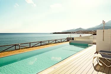 Hoppa direkt ner i poolen från din terrass! Lägenheter eller rum med extra hög komfort.