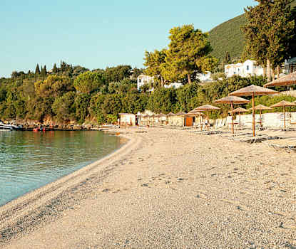 En idyllisk strand i Porosbukten. Uthyrning av solstolar och parasoller. Restaurang. Cirka 15 kilometer från Nidri.Vasiliki