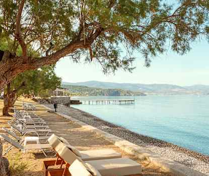 Stranden i Molivos består av sten vilket gör att vattnet är klart och rent, men några meter ut är det sandbotten. På stranden finns solstolar och parasoll att hyra.