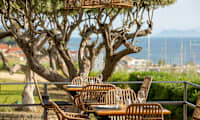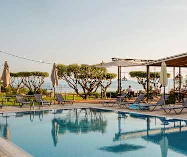 Inbäddat mellan två av hotellets byggnader ligger hotellets trevliga poolområde med solstolar och parasoll.