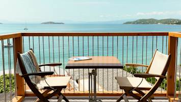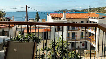 När du vill bada finns det en trappa som leder direkt ner på stranden. Solstolar finns att hyra och blir du sugen på att aktivera dig finns diverse vattensporter att pröva på. När du önskar besöka Skiathos stad, promenerar du i en charmig liten gränd till huvudvägen som fortsätter ner till den mysiga stadskärnan, där du hittar ett stort utbud av restauranger och butiker.