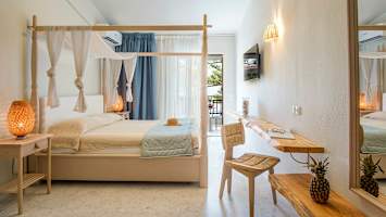 Hotel Bourtzi erbjuder ljusa och fräscha dubbelrum för upp till tre personer.