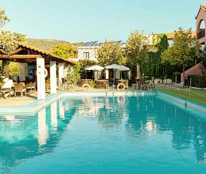 Rigas Hotel har ett inbjudande poolområde med solstolar och parasoll samt en poolbar med servering av dryck, snacks och enklare rätter.
