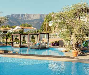 - Vardagsrum med en sittgrupp samt en terrass med pool på nedre våningen