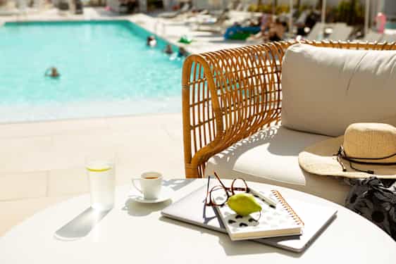 Varför inte unna dig ett semesterkontor när du bor på Sunprime? Här finns ett höj- och sänkbart skrivbord, kontorsstol, datorlampa, 24 tum bildskärm, tangentbord & mus, block & penna, fruktkorg – samt en solskärm till datorn så att du kan sitta ute på balkongen och jobba.