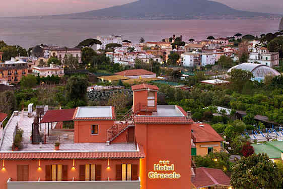 Girasole är ett härligt hotell med romantisk atmosfär och vacker utsikt över Sorrentobukten och Vesuvius. Hotellet har ett fint poolområde i en stor grönskande trädgård. Blir du sugen på något att äta så serveraras det ett bra urval av lokala rätter, glass, smörgåsar och hemgjorda kakor i baren. Från Girasole tar det cirka 20 minuter att promenera in till Piazza Tasso, där du hittar både restauranger och shopping.
