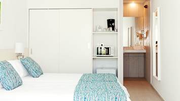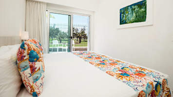 På Dunagolf kan du välja om du vill bo i en lägenhet som alla ligger i bungalows utspridda över hotellområdet eller i ett dubbelrum med terrass under marknivå i huvudbyggnaden.