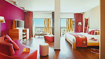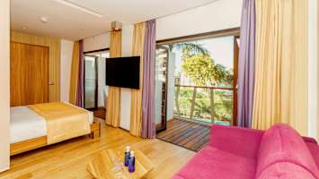 - Juniorsviten består av ett rum med dubbelsäng och en loungedel med soffa och bord