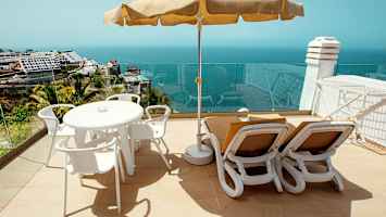 - Större balkong (ca 45-57 m²) med parasoll och två solstolar i trä med tjocka madrasser