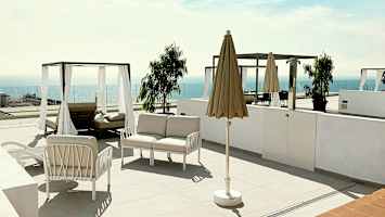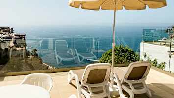 - Terrassen fortsätter ut i ett gemensamt soldäck (ca 300 m²) som ligger ovanpå restaurangen och delas med tre andra lägenheter. Till varje lägenhet hör en balisäng, soffgrupp och utedusch. Det finns även gemensamma stolar och bord på soldäcket