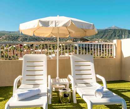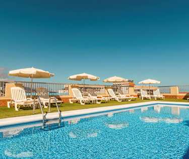 GF Noelia har en fin takterrass med konstgjort gräs och en pool. Här kan du varva ner i en solstol och njuta av utsikten mot omgivningarna.