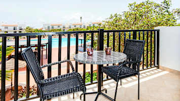 Hotellets luftiga poolområde passar perfekt för stora och små gäster och här finns både en stor pool och en integrerad barnpool.