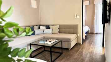- Sovrum med en dubbelsäng och vardagsrum med bäddsoffa