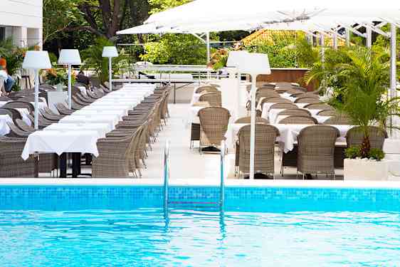 Från Miramares egen restaurang och poolområde har du fantastisk utsikt över hamnen och de mäktiga Biokovobergen som reser sig strax innanför kusten.
