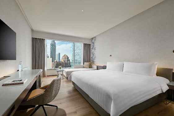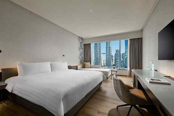Traders Hotel Kuala Lumpur ligger i hjärtat av KLCC, direkt anslutet till Convention Centre och mittemot Petronas Towers. Som gäst har du bekväm tillgång till förstklassiga konferens-, affärs-, shopping-, underhållnings- och transportfaciliteter. KL Light Rail Train (LRT) ligger på gångavstånd och Kuala Lumpur International Airport (KLIA) ligger en timmes bilresa bort. Hotellet erbjuder fina och avslappnade matupplevelser, ett business center, hälsoklubb, spa, inomhuspool och mötesrum. Bland matalternativen finns två eleganta restauranger som serverar asiatisk/västerländsk mat och en takbar. Rekreationsfaciliteter inkluderar ett gym, takpool, spa och en joggingled i den intilliggande parken. Hotellets 571 moderna rum och sviter erbjuder utsikt över KLCC Park och Twin Towers. Varje rum har separat badkar och dusch, en 55-tums Smart IPTV med Netflix och YouTube, rörelsesensorstyrd belysning, USB-C- och USB-A-laddningsportar, elegant vinylgolv och en mysig dagbädd. Observera att det tillkommer en turistskatt på MYR 10, 00 per rum och natt för utländska passinnehavare.