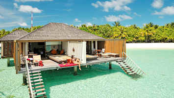 Bo granne med Indiska oceanen. Stege ner i vattnet från soldäcket. Solstolar och bord på soldäcket. Water Villas är ca 77 m² inklusive badrum och terrass.