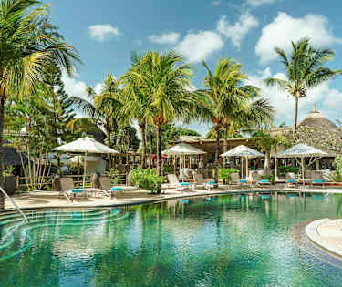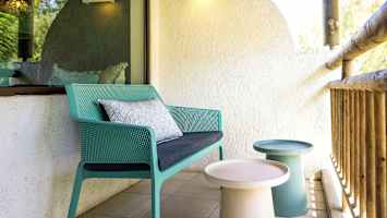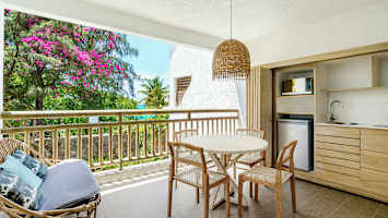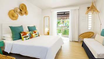 Trevliga rum med en ljus inredning i ljusa blå- och gröna toner. Här har du från rummets balkong eller terrass en härlig utsikt över omgivningarna och trädgårdens vajande palmer och grönska.