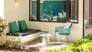 Dubbelrum deluxe har en mer färgrik inredning med toner åt det mörkgröna/mörkturkosa hållet vilket ger en varm atmosfär och tack vare de ljusa detaljerna och stora fönstren har rummet fortsatt en ljus känsla. Här kan du sitta bekvämt på balkongen eller terrassen med en svalkande drink från minibaren och njuta av palmernas sus.