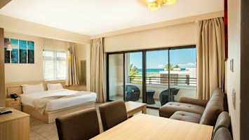 Enrumslägenhet med balkong mot omgivningarna och havet.