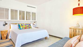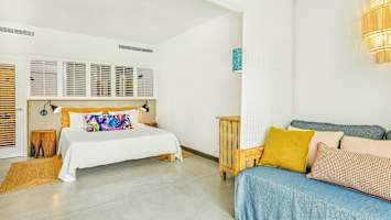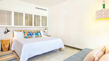 Modernt designade rum i rustik stil med fina trädetaljer. Tack vare de stråklädda taken får man en känsla att man bor i en strandhydda men med alla bekvämligheter som man kan tänka sig.