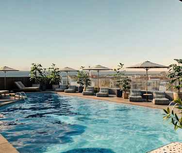 Hotellets lilla poolområde ligger på takterrassen, som nås via trappor från våning fem. Här väntar en vacker utsikt över Funchals stadskärna. Runt poolområdet och i dess anslutning finns två mindre solterrasser med solstolar och parasoller.