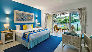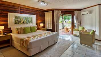 Rummen har mörka och varma träväggar. Samtliga rum ligger på andra våningen har balkong med utsikt över havet och hotellets tropiska trädgård.