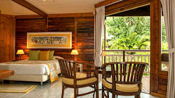 Rummen har mörka och varma träväggar. Samtliga rum har en trevlig terrass med utsikt över hotellets tropiska trädgård.