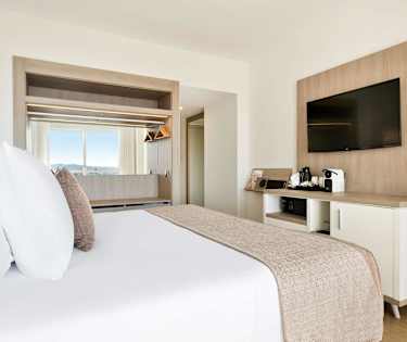 , Sitges, med utsikt över Aiguadolç Marina. De 307 hotellrummen är utrustade med badrum/dusch, luftkonditionering, TV, telefon, internet, minibar och safe (extra avgift). Ett 4-stjärnigt hotell