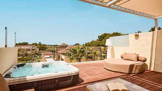 Här bor du i ljusa och fräscha dubblettrum, och vill du göra något extra av din resa bokar du en rum med privat pool eller med takterrass och bubbelpool.