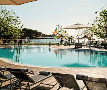 Stranden Son Caliu framför hotellet har stenig botten och du badar från en plattform. Ca 700 meter till den större sandstranden i Palma Nova.
