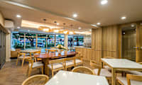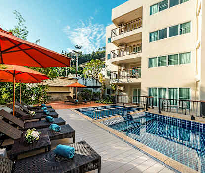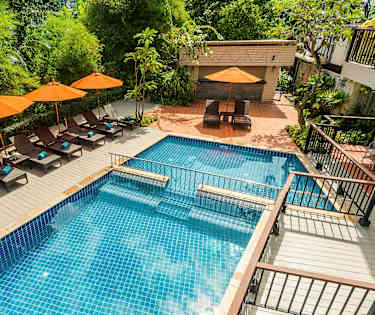 Litet poolområde med solstolar och parasoll. Här finns även en poolbar som serverar dryck under dagen.