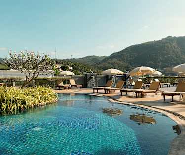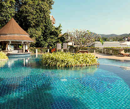 Hotellet har ett stort poolområde med flera pooler samt solstolar och parasoll.