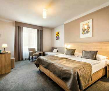 Dubbelrum superior är något större än dubbelrum standard och har vattenkokare samt ett litet kylskåp.