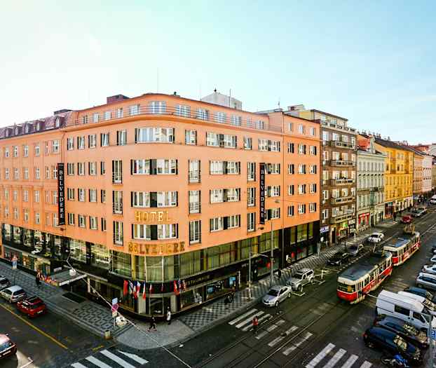 Belvedere är ett enkelt hotell och ligger på andra sidan floden Vltava i ett distrikt som kallas Prag 7 och här trivs du som vill bo centralt till ett bra pris. Från hotellet är det ett par kilometer till den populära boulevarden Václavplatsen och Prags gamla stadsdel. Vill du inte promenera finns spårvagnshållplats utanför hotellet och tunnelbana några hundra meter bort.