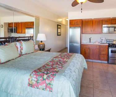 bilresa från Honolulu. De flesta rymliga rum har panoramautsikt över stranden och Stilla havet. De har också eget badrum och individuellt reglerad luftkonditionering. Köksenheterna erbjuder kylskåp, spis samt faciliteter för att göra te och kaffe.